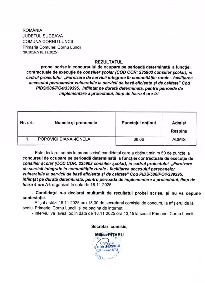 Rezultatul probei scrise la concursul de ocupare pe perioada determinata a functiei contractuale de executie de consilier scolar